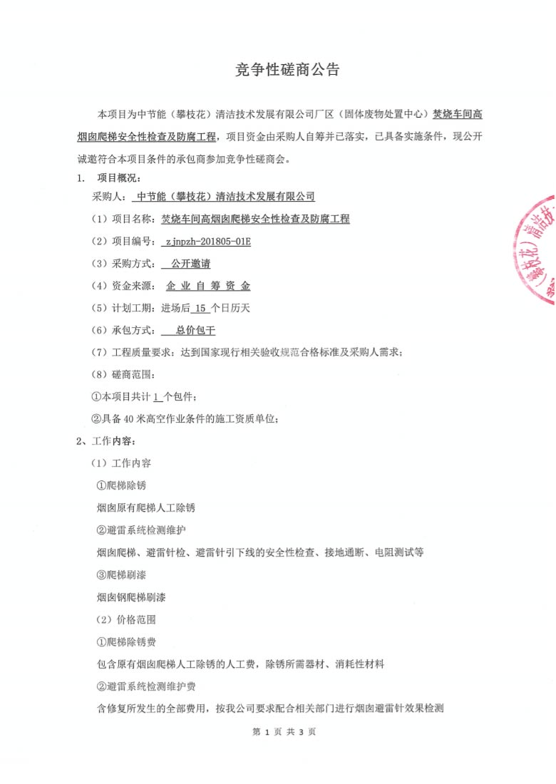 焚燒車間高煙囪爬梯安全性檢查及防腐工程競(jìng)爭(zhēng)性磋商公告